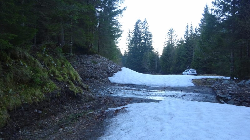 On nous avais annoncer la possibilité de démarrer au niveau de Saint Bruno (1000 m) mais la route est libre hormis un arbre qui est promptement dégagé en le tirant avec la voiture grâce une sangle. Finalement nous montons jusqu’au niveau du ruisseau du grand Orgeval (1152 m).