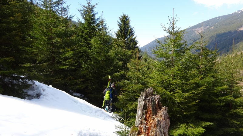 A 1900 m nous choisissons de descendre rive gauche par des pentes soutenues toujours en bonne neige. Évidemment avec la chaleur ça se dégrade et les derniers 50 m (au niveau de la cascade de Cohardin) pour rejoindre la piste forestière sont une vrai galère : bois touffus et par endroits, accumulations de neige très molle qui enfonce….
