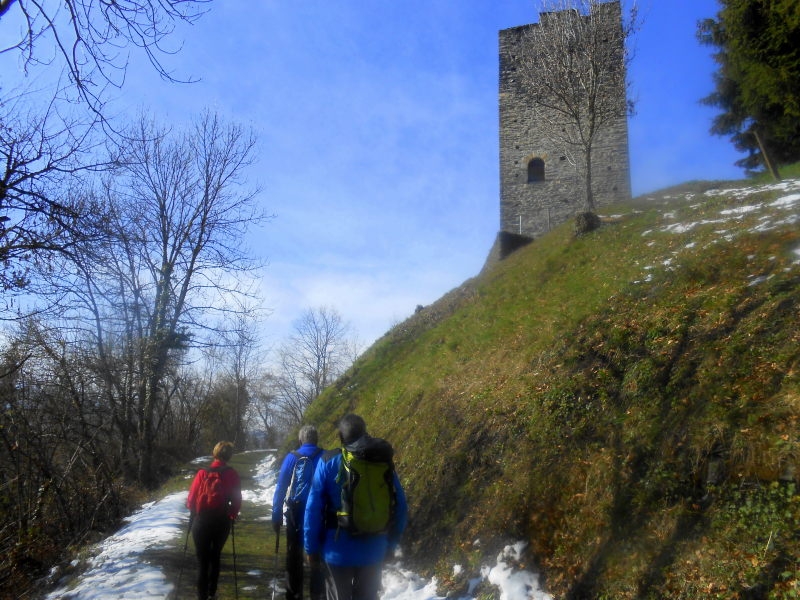 Nous fêtions le printemps en forêt, avec de larges points de vue dévoilant au fur et à mesure de la montée, les massifs montagneux enneigés à l’est comme à l’ouest. La perspective de verdure de la crête de Montraillant était ponctuée de vestiges, d’abord la Chapelle Saint Michel puis les 2 tours de Montmayeur (nord-est et sud-ouest), érigées sur une motte (butte) castrale caractéristique des fortifications médiévales. Ce site a été mis en valeur depuis plusieurs années, notamment les habitations et église adjacentes aux tours seigneuriales, avec des informations présentées de façon ludique.