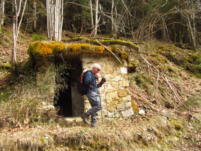 Sur des tapis de feuilles mortes beige, parmi une végétation et des rochers tapissés de mousse humide vert sombre, nous avons ainsi franchi 2 tunnels remarquablement taillés dans la roche, enjambé les torrents et les arbres tombés au sol, escaladé, observé les ouvrages liés aux captages et les chalets de Karma-Ling en contrebas, repéré quelques cairns ou balisages verts et admiré ponctuellement nos montagnes voilées par le sable du Sahara.