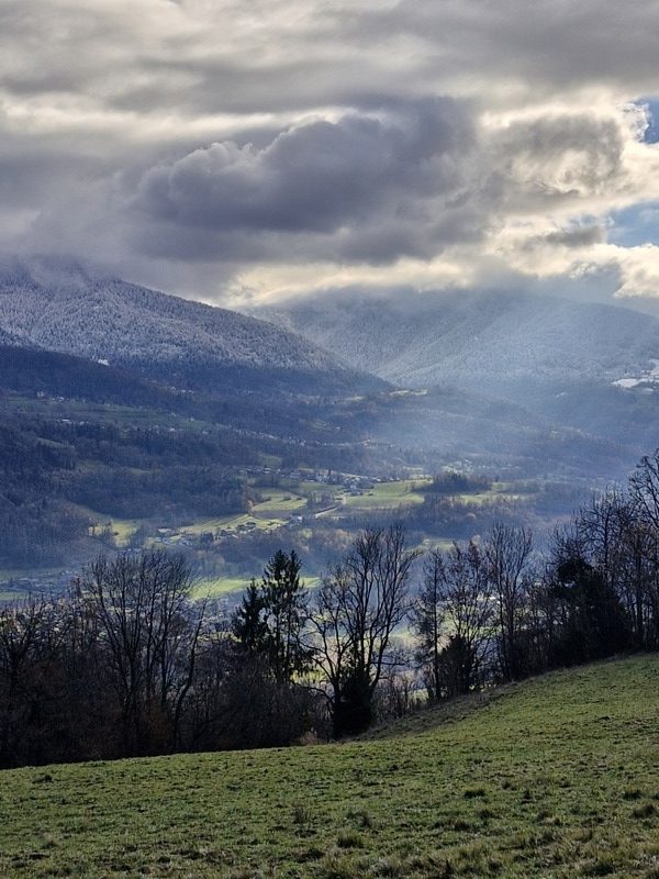 Les Tours de Montmayeur furent une fois encore choisies pour une halte gourmande ( mais bien fraîche à l’ombre de la haute Tour nord !), après 2 h 30 d’un parcours agréable débuté dans le charmant village de La Trinité. Le circuit du jour passait par le col de Cochette, puis rejoignait les ruines de la Chapelle Saint Michel par une piste forestière parfois boueuse, pour enfin accéder aux 2 tours remises en valeur par des passionnés de patrimoine. Ce jour-là, le sol tapissé de feuilles mortes ne fut pas trop glissant, quoique ! L’itinéraire se faufilait le long des crêtes de Montraillant, ouvrant des vues magnifiques sur le massif de la Lauzière bien enneigé, et sur les Bauges.
